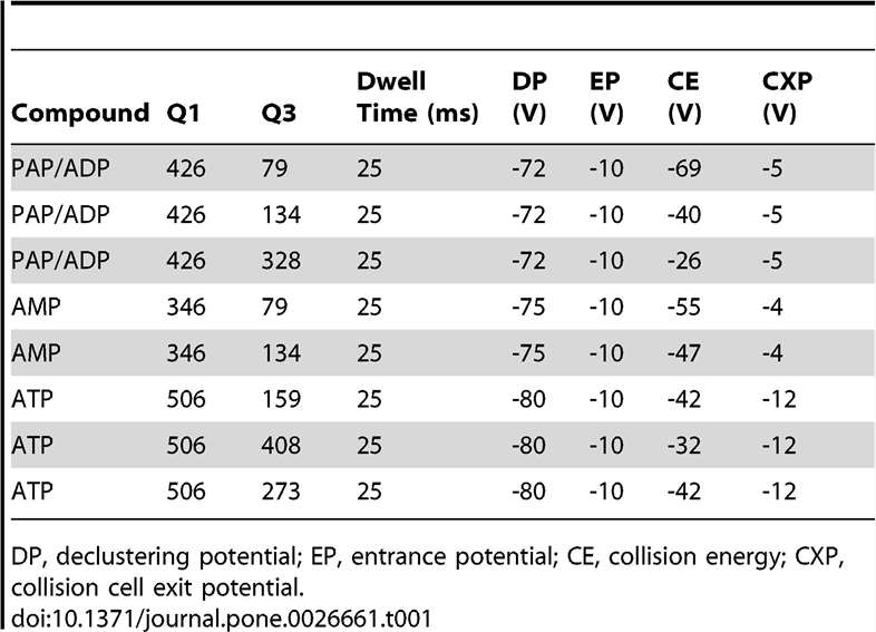 MRM transitions for AMP, ADP, ATP, and PAP.