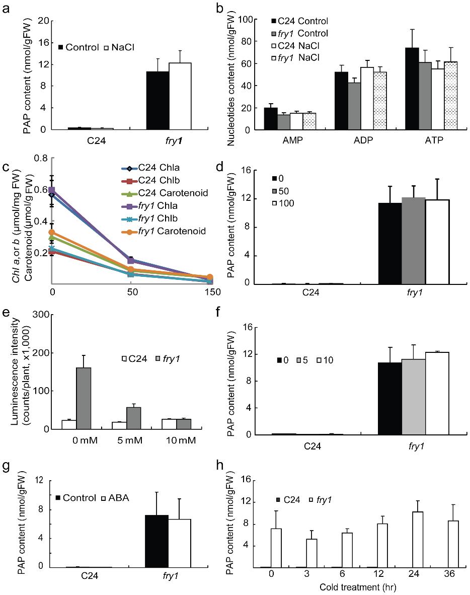 PAP content in wild-type C24 and fry1 seedlings treated with either salt, ABA, or cold.