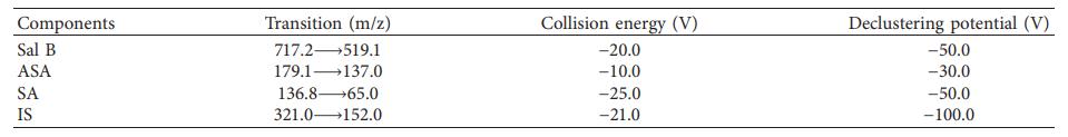 Table 1: MS/MS ion acquisition parameters of Sal B, ASA, SA, and IS