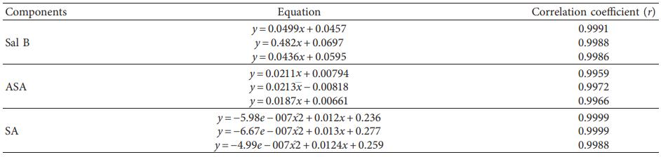 Table 2: Calibration curves and correlation coefficients of Sal B, ASA, and SA.