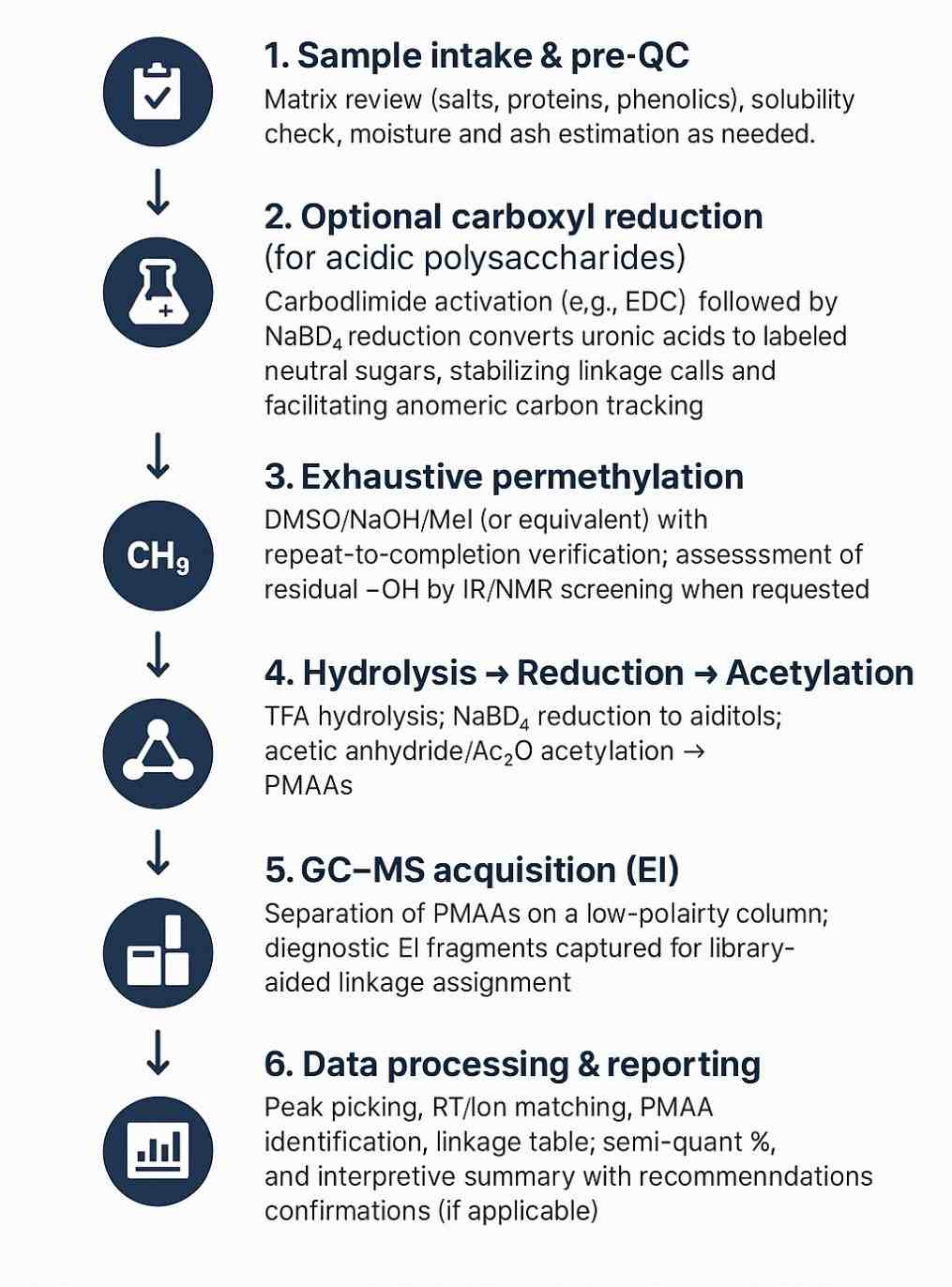- Acidic polysaccharides: Standard carboxyl reduction workflow with NaBD4 labeling for robust linkage calls.