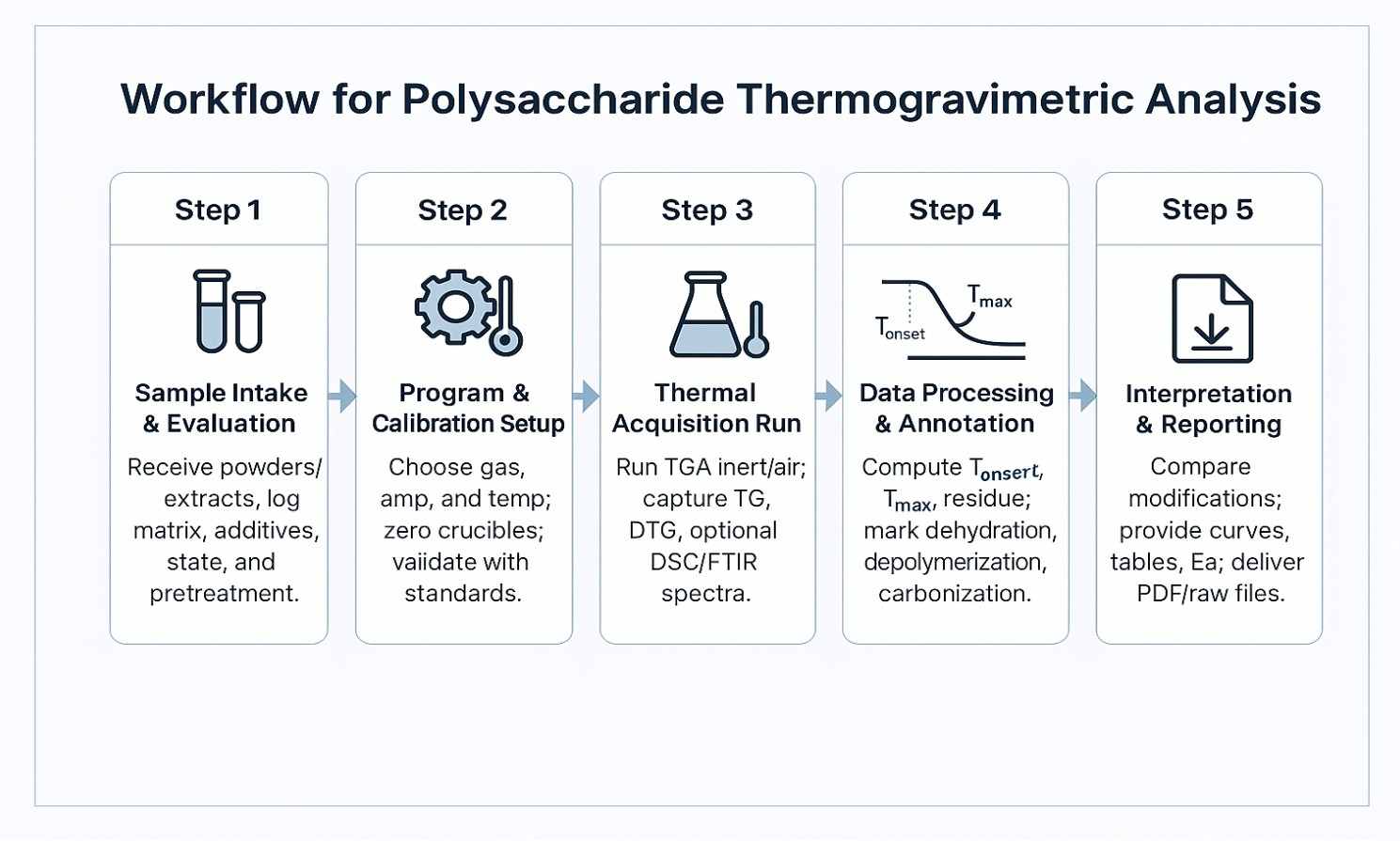 Thermogravimetric analysis measures sample mass versus temperature or time under controlled atmospheres. For polysaccharides, it reveals: