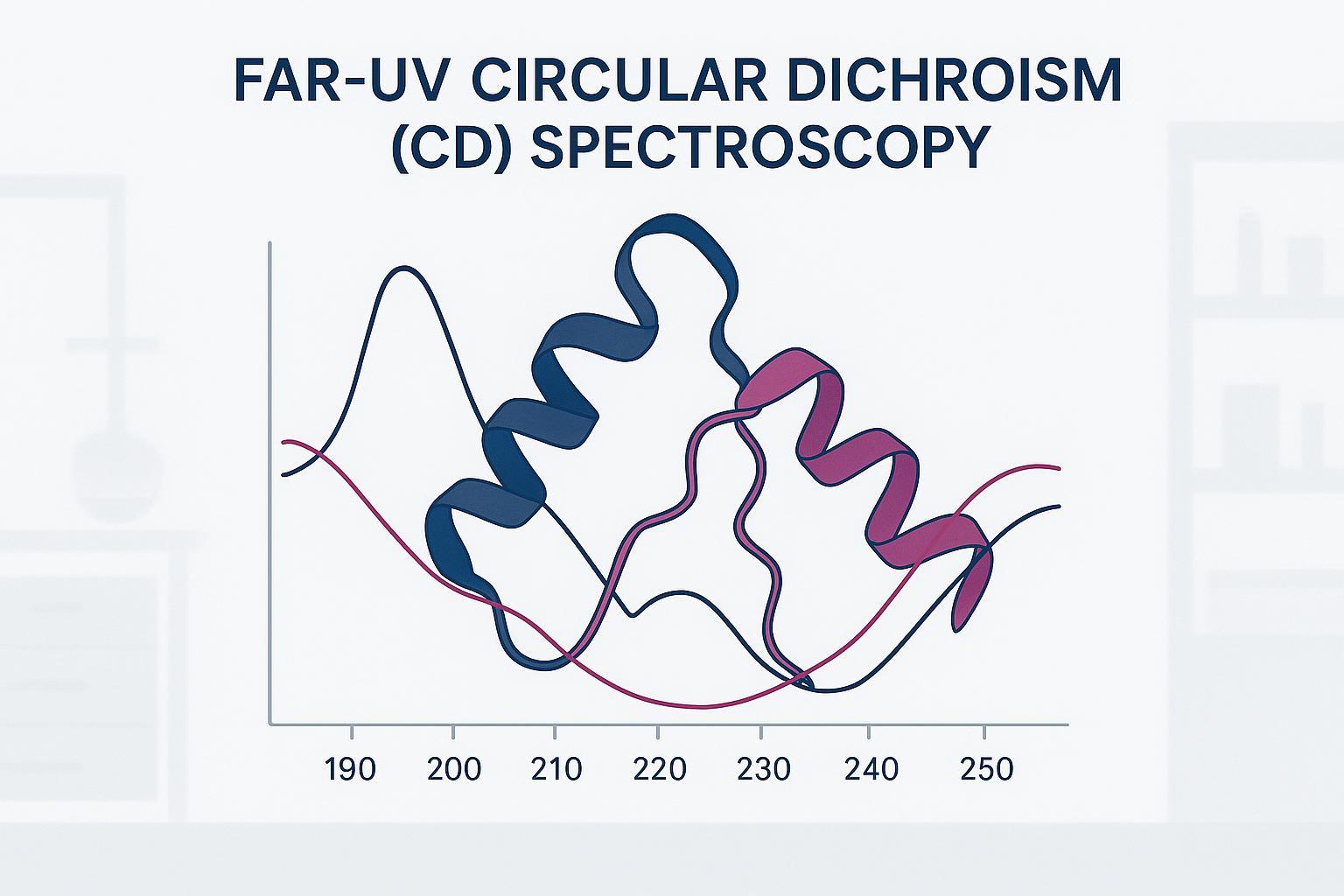 Far-UV CD (roughly 190–250 nm) probes peptide-bond transitions that encode secondary-structure signatures—classic α-helix valleys near 208/222 nm, β-sheet features around 195–218 nm, and "other" elements. It can estimate relative proportions and detect folding changes, but it won't give atomic detail or unambiguously resolve mixed conformations without caveats. Synchrotron radiation CD (SRCD) improves low-wavelength access; most benchtop instruments are buffer- and HT-limited below ~190–200 nm.