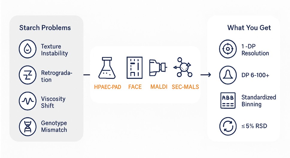 - Wide Quantitation Window (DP 6–100+): Captures full chain spectrum—from short crystallinity-linked chains to long branches driving gel properties.
