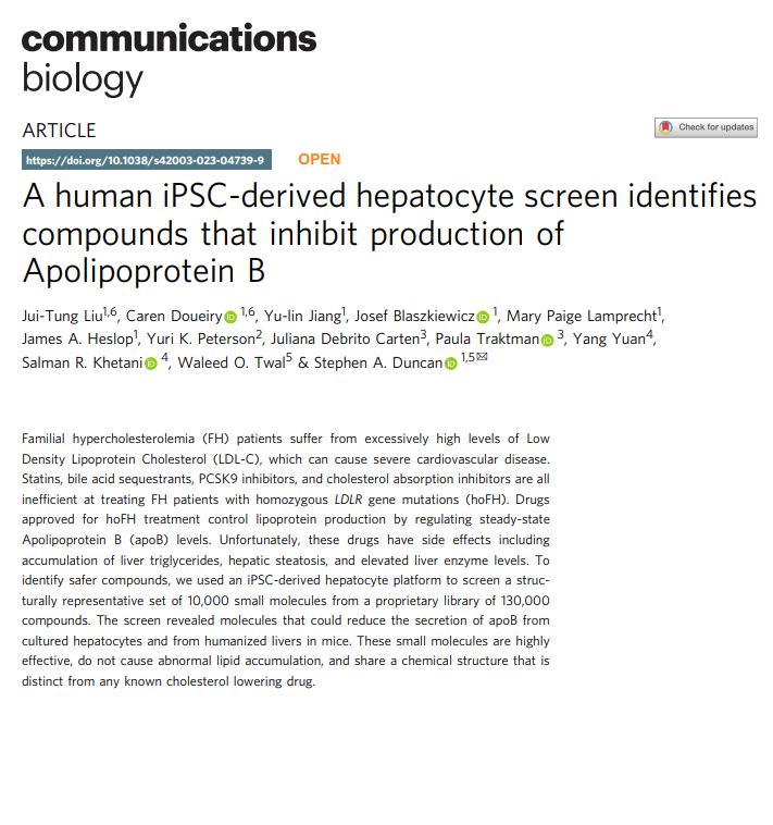 - A human iPSC-derived hepatocyte screen identifies compounds that inhibit production of apolipoprotein B. Communications Biology. 2023.