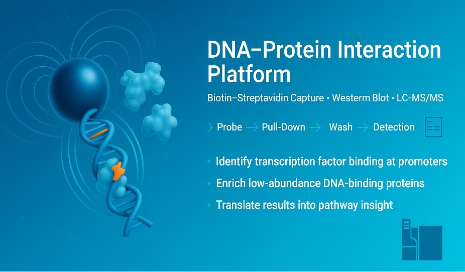 DNA pull-down is an in-vitro method to study DNA–protein interactions. A biotin or desthiobiotin–labeled double-stranded DNA probe representing a promoter, enhancer, or variant-altered motif is immobilized on streptavidin magnetic beads. The probe–bead complex is incubated with a nuclear extract, washed under nuclease-free conditions, and eluted. Captured proteins are then analyzed by Western blot for targeted validation or LC–MS/MS for unbiased discovery.