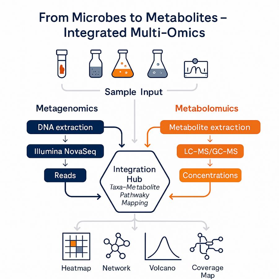 Integrated metagenomic and metabolomic analysis combines shotgun metagenomics (who's there, what genes and pathways they encode) with LC/GC–MS metabolomics (what molecules are produced or consumed) in the same samples. This delivers a mechanistic map from microbial community structure → functional potential → realized metabolic state.