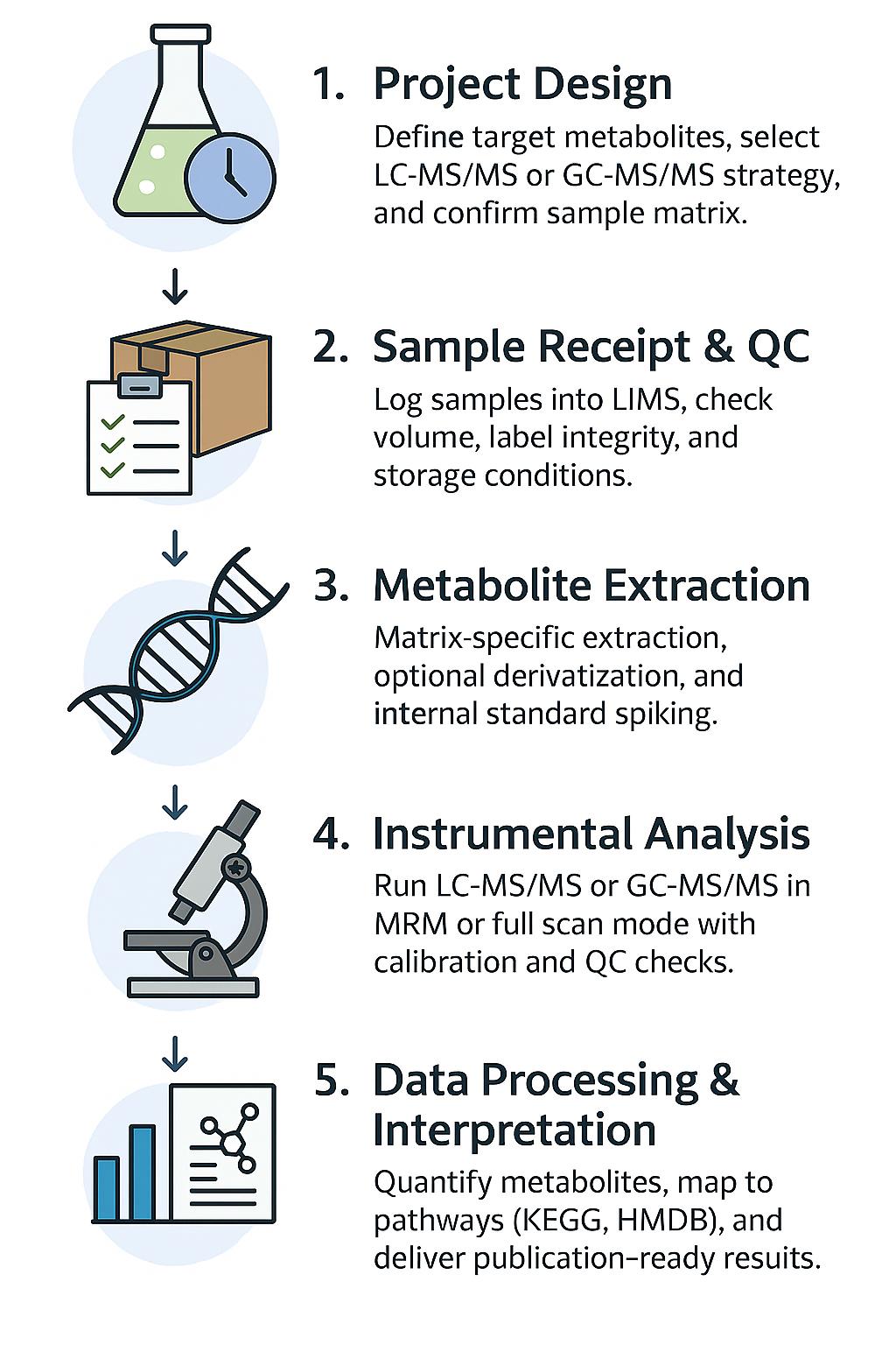 Define research objectives, sample types, and target metabolite classes (e.g., SCFAs, bile acids, indoles). Our experts assist in selecting targeted vs. untargeted strategies and compatible matrices.
