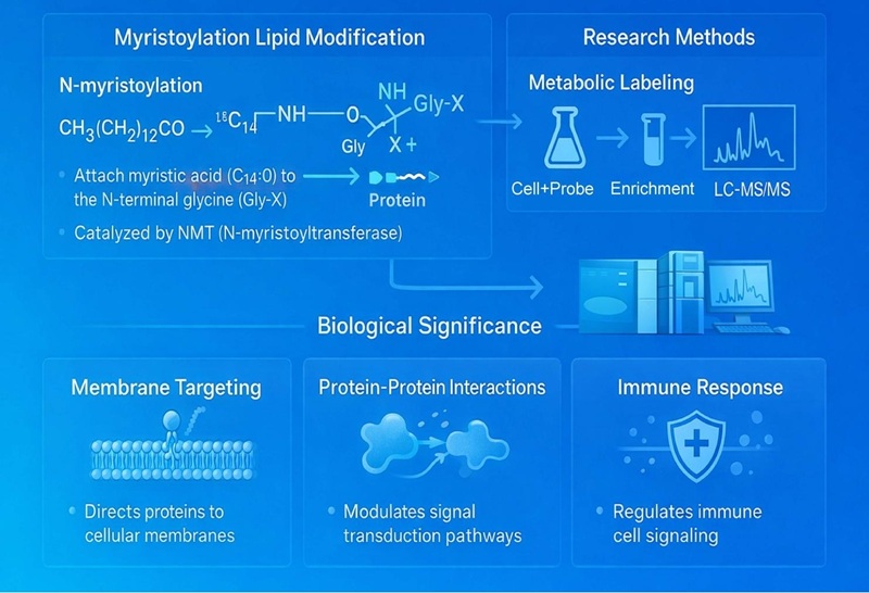 Owing to the critical role of protein myristoylation in regulating membrane targeting, signal transduction, and protein–protein interactions, protein myristoylation represents a fundamental regulatory mechanism and an emerging target in biomedical research. Therefore, systematic identification of myristoylated proteins and precise N-terminal modification sites within cells is essential for understanding their biological functions and disease relevance. We provide comprehensive myristoylation proteomics services, including selective enrichment strategies, high-resolution LC-MS/MS detection, site-specific identification, quantitative profiling, and advanced bioinformatics analysis. Our services enable researchers to globally characterize myristoylated proteins, delineate myristoylation-dependent signaling pathways, and explore their potential roles in disease mechanisms and therapeutic development.