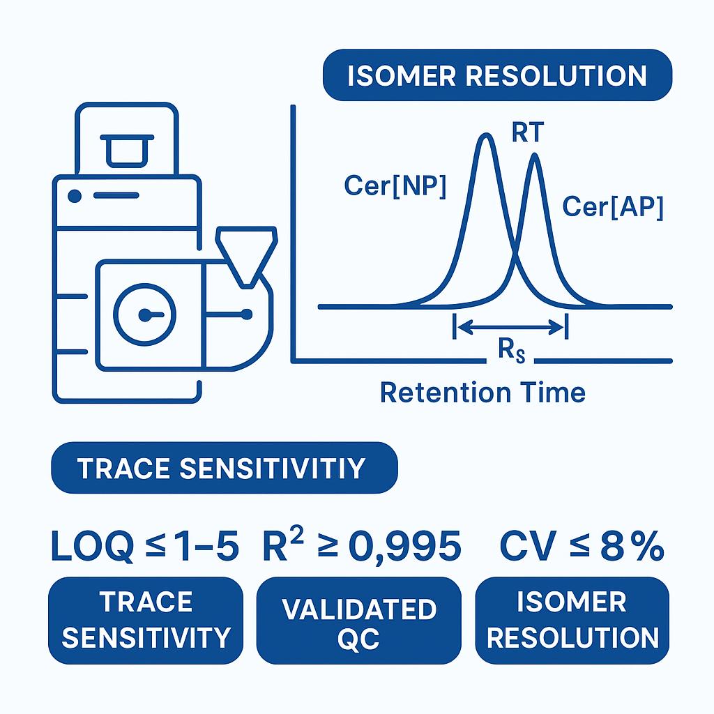 - Isomer separation: Rs ≥ 1.2 between Cer[NP] and Cer[AP] on HILIC; reproducible RT windows (RSD ≤ 0.3%).