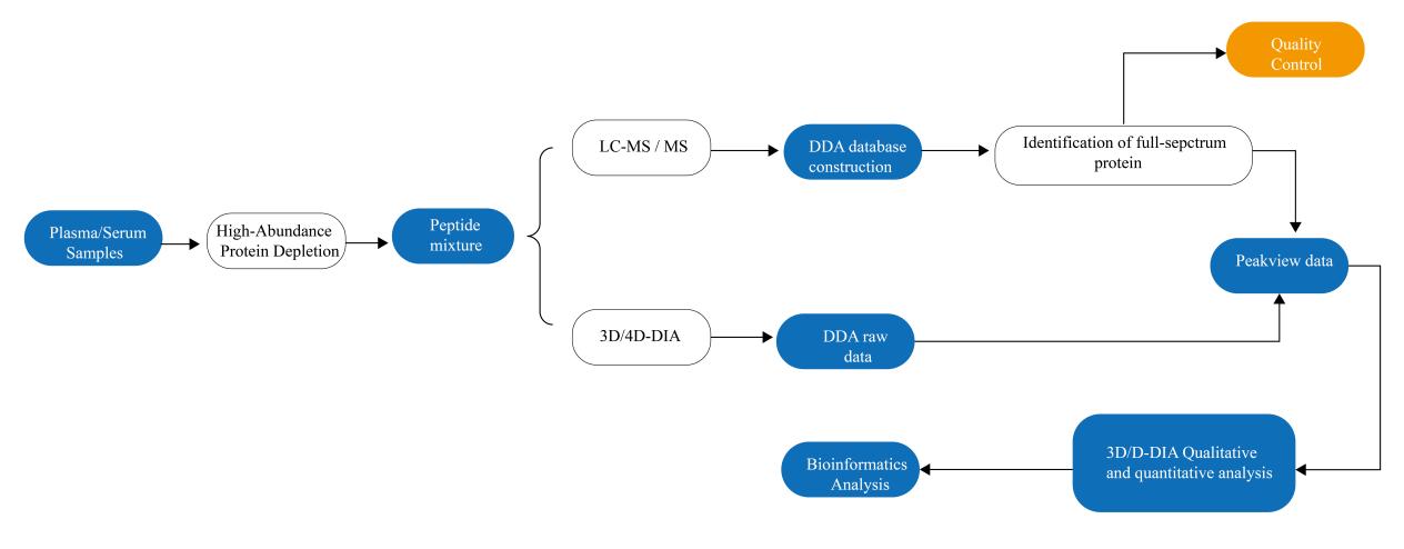 After blood collection, samples undergo preprocessing steps, including centrifugation, quality screening, protein extraction, and dehydration, ensuring sample purity and stability. Based on experimental needs, appropriate methods for high-abundance protein depletion are selected to optimize the analysis.