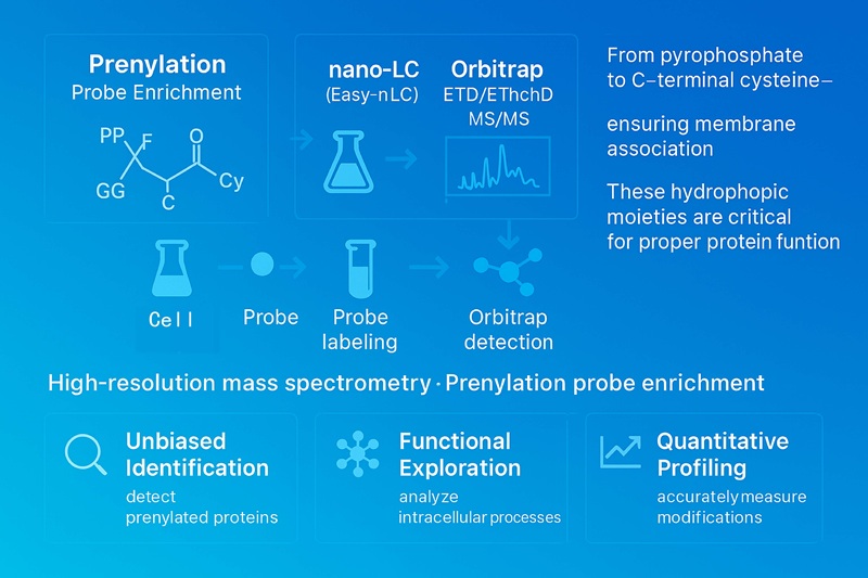 Given the biological importance and site-specific nature of prenylation, it is not only a fundamental regulatory mechanism but also a promising target for therapeutic and biotechnological applications. Therefore, identifying prenylated proteins and their sites in cells is essential. We offer comprehensive prenylation proteomics services, including high-resolution mass spectrometry, site-specific identification, quantitative profiling, and advanced bioinformatics analysis. Our services help researchers investigate prenylated proteins systematically, explore their pathway associations, and uncover their clinical and therapeutic significance.