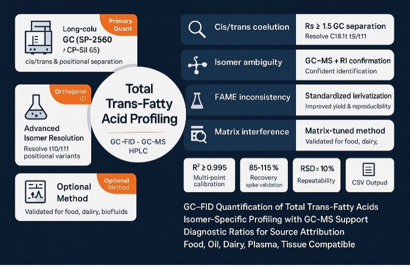 - Quantitative Analysis of Total Trans-Fatty Acids. GC-FID primary quantitation with GC-MS support across foods, oils, tissues, and cell samples.
