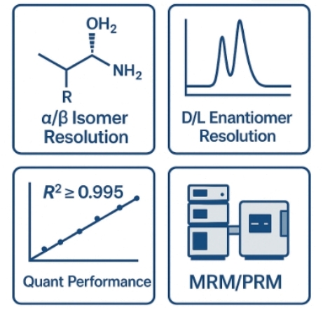 - Isomer Interference: α/β isobars and coeluting amines cause false positives. We implement orthogonal separation (HILIC or mixed-mode; optional chiral columns) with MRM confirmation to remove ambiguity.