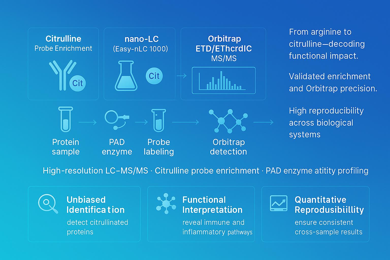- Advanced technology: LC–MS/MS + citrulline-specific probe enrichment for precision and depth.